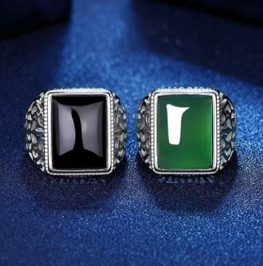- 銀色戒指霸氣男士款帝王綠黑玉石戒子 NT$380