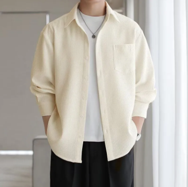 襯衫華夫格男士外套新款休閒百搭襯衣長袖潮流高級寬鬆
