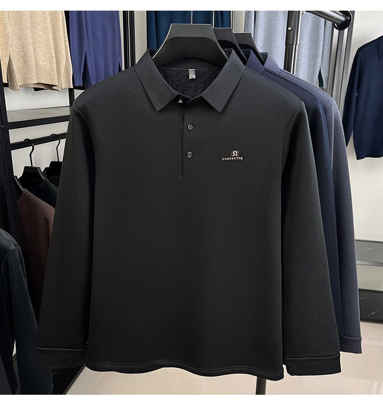 翻領 POLO 高檔長袖 T 恤男士加絨加厚一體絨純色休閒商務上衣打底衫