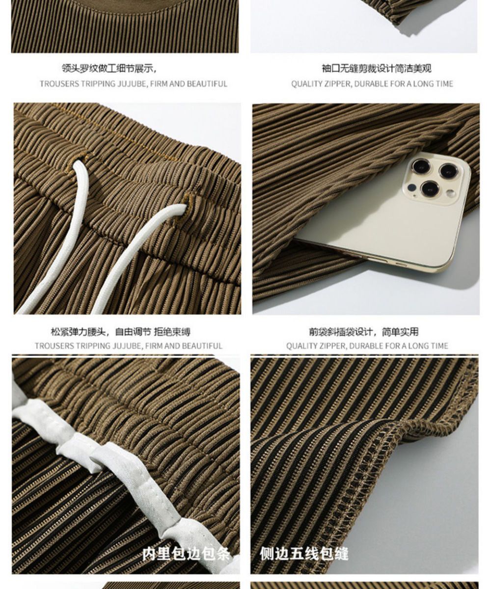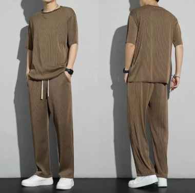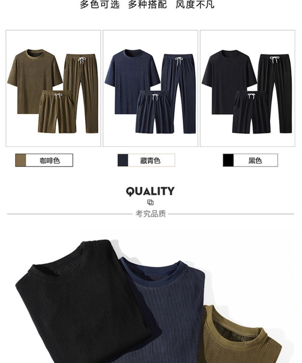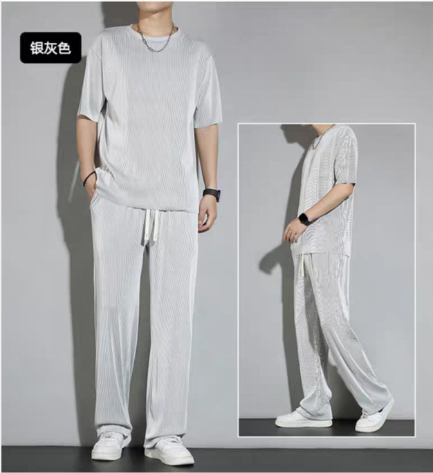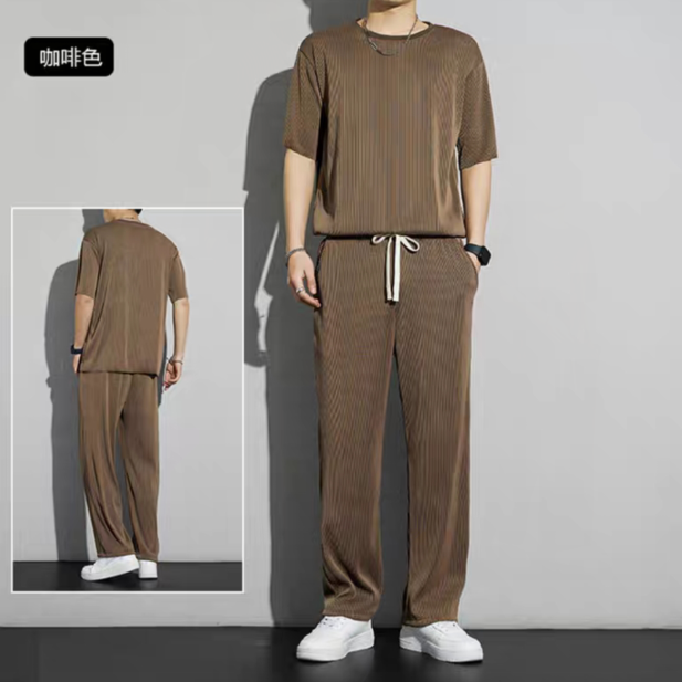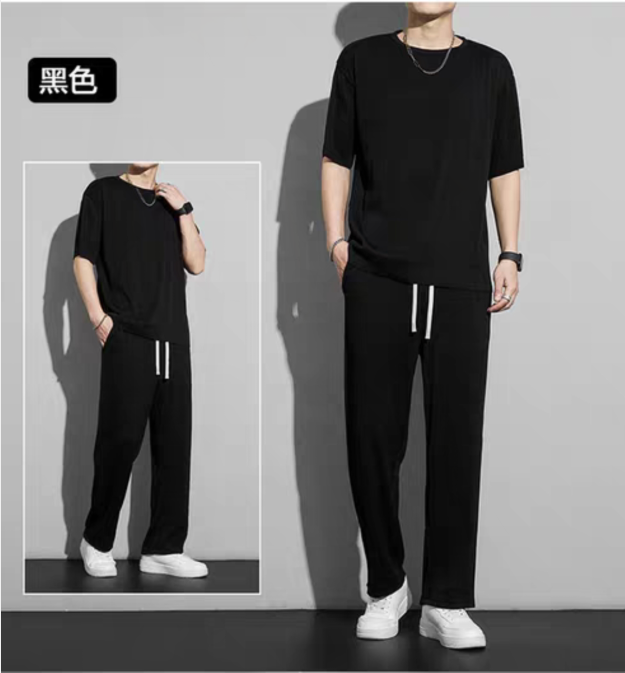 速乾冰絲套裝男士夏季休閒寬鬆休閒運動套裝潮牌男短袖長褲兩件套